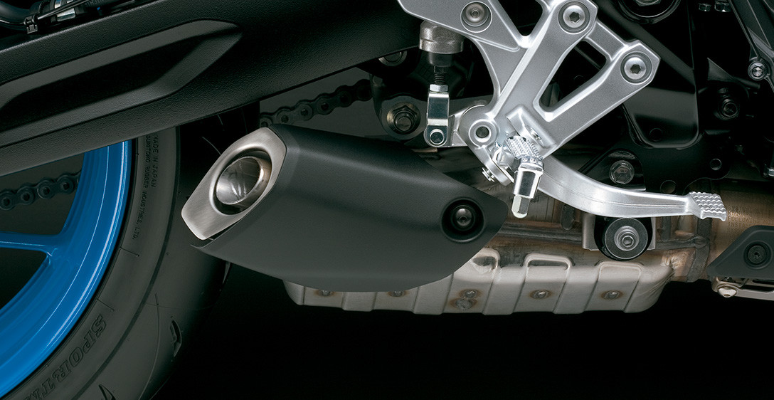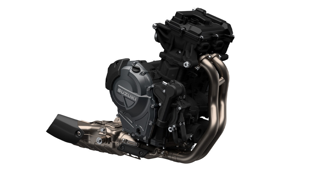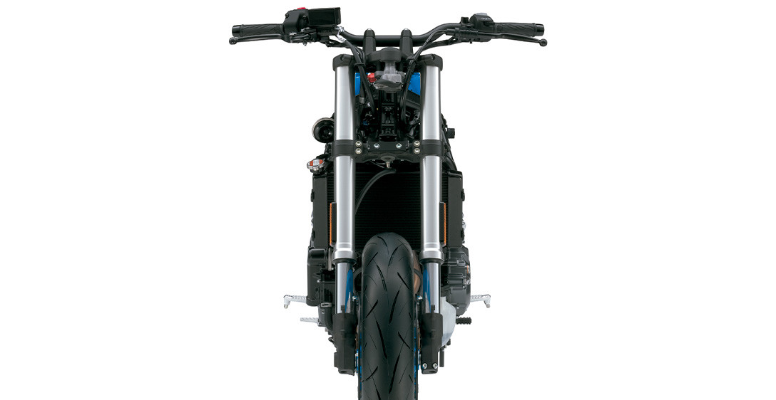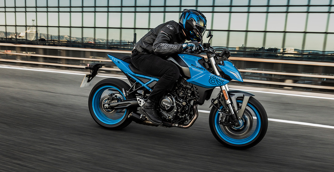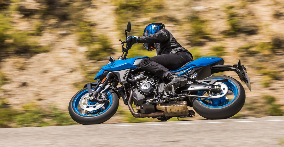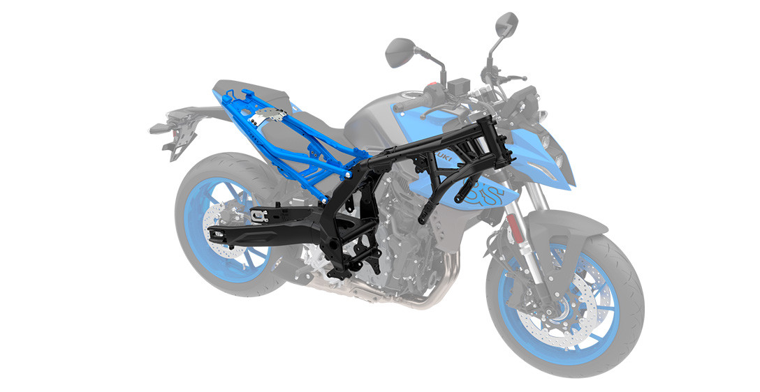 Tudo o que você precisa fazer é olhar para a GSX-8S para ver como o chassi foi cuidadosamente projetado para ser fino, compacto, leve, altamente ágil e ideal para suportar seu motor dois cilindros em linha de alto desempenho. Cada aspecto reflete um forte foco na excelente manobrabilidade e controle, mesmo quando conduzida com as malas laterais opcionais instaladas, e na minimização da fadiga, quer seja pilotando sozinho ou transportando passageiro. O chassi é composto por uma estrutura forte e altamente rígida, projetada para a GSX-8S. As longarinas de apoio do assento expostas fornecem suporte sólido, ao mesmo tempo que contribuem para uma aparência elegante e despojada de beleza funcional. A leve balança de alumínio, projetada exclusivamente para a GSX-8S, é otimizada para um desempenho ideal nas ruas. A geometria do chassis foi meticulosamente planeada para proporcionar estabilidade em linha reta e condução ágil, juntamente com uma posição de condução confortável que distribui eficazmente o peso na frente e na traseira. As dimensões compactas da dianteira e da parte de trás do novo motor bi cilíndrico em linha da Suzuki, beneficiam ainda mais a geometria do chassi ao definir um ponto de quadril posicionado para a dianteira, que permite transferir seu peso para a frente e controlar mais facilmente a GSX-8S ao mergulhar em curvas fechadas.