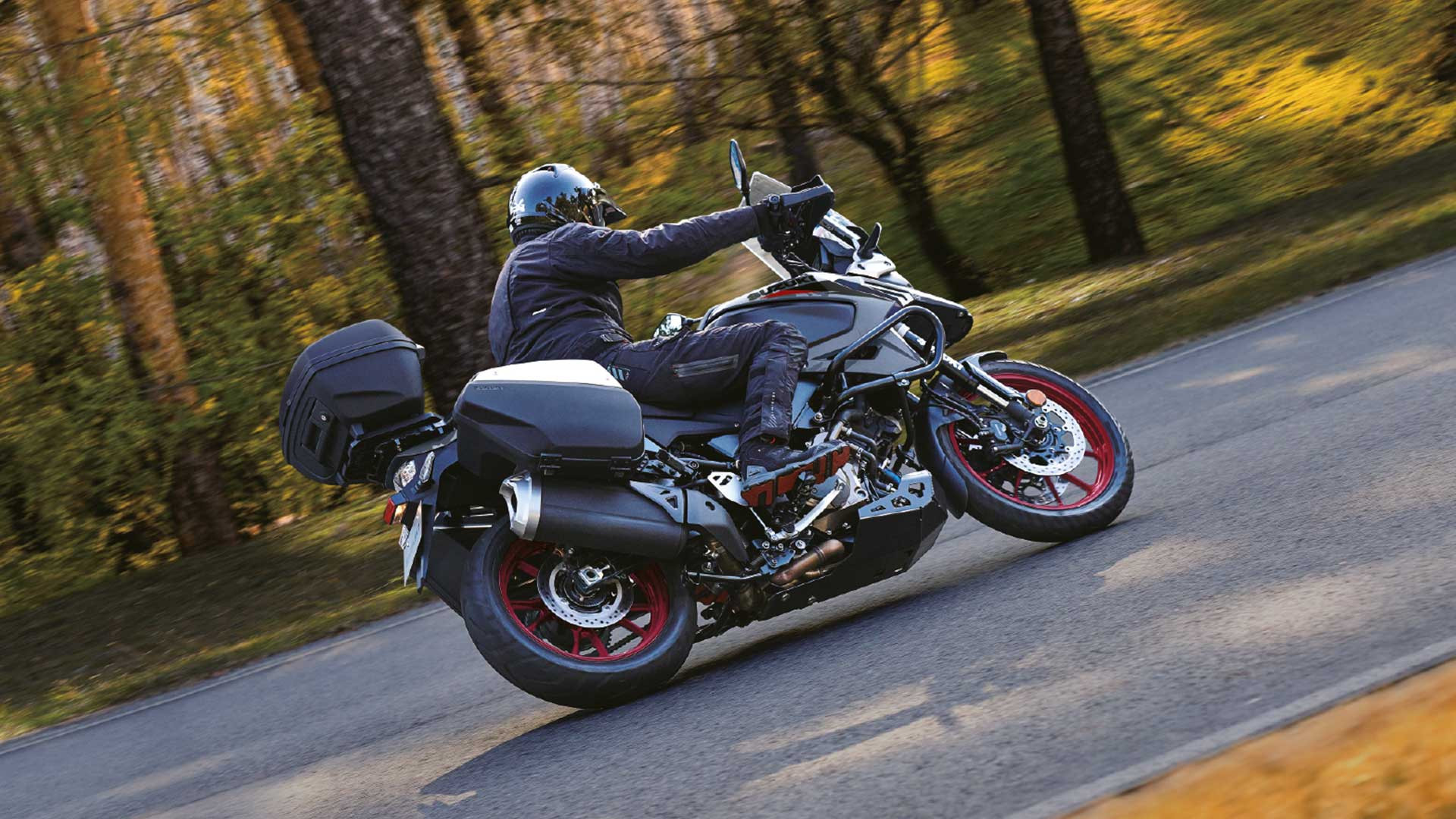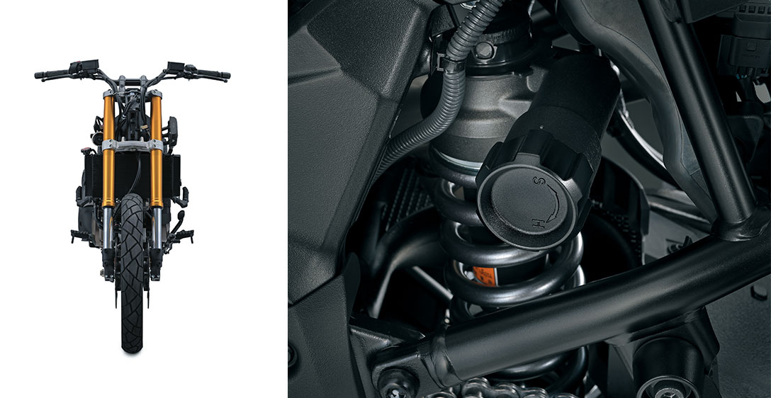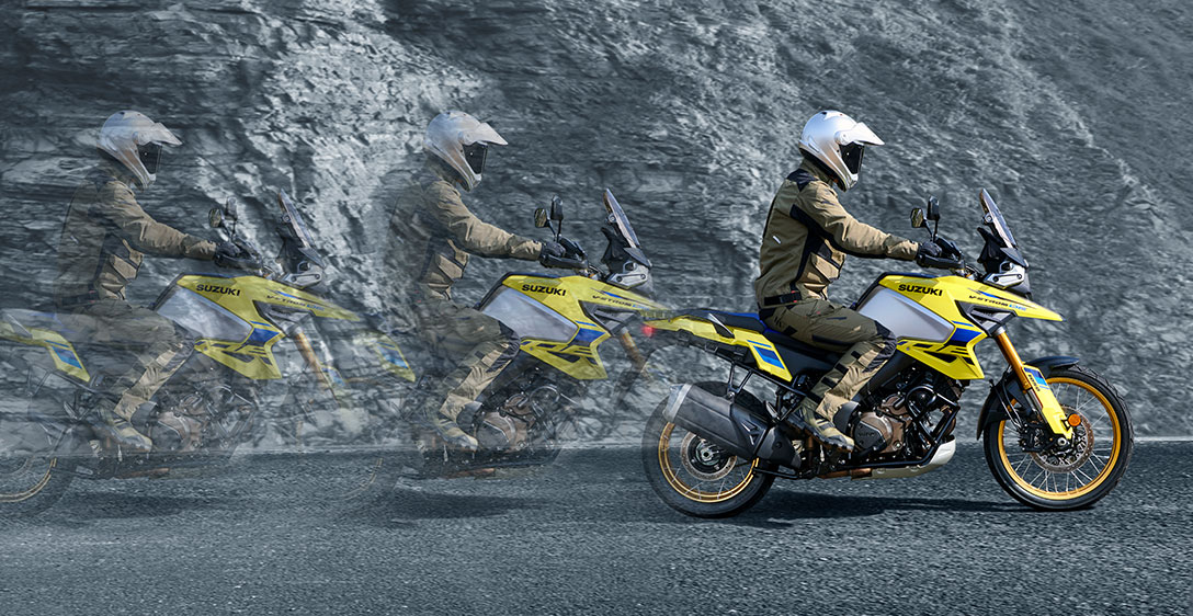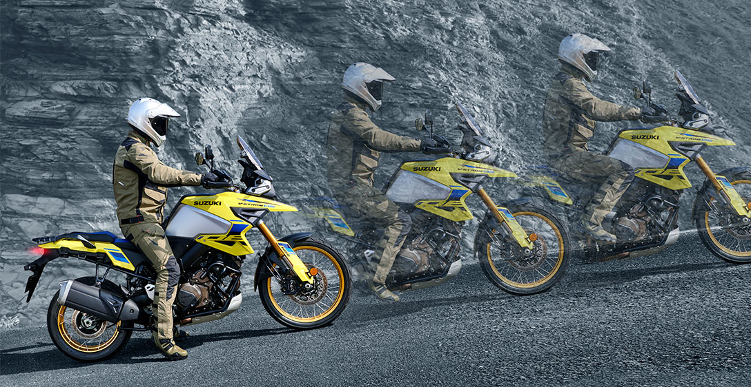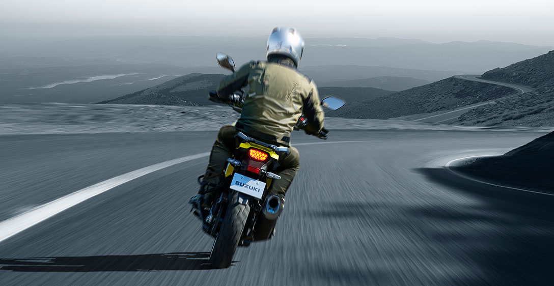 DESEMPENHO PARA AGRADAR O motor V-twin DOHC de 1.037 cm³ de quatro tempos e 90° da Suzuki apresenta forte torque linear na faixa de rotação média e uma natureza de rotação livre que maximiza a potência na faixa de alta rotação. Há também um prazer palpável, mas quase indescritível, em seu ruído característico do V-twin e na nota de escape. Seu layout V-twin também permite um design de chassi mais fino com um centro de gravidade mais baixo, o que contribui para um manuseio mais ágil e maior manobrabilidade.
