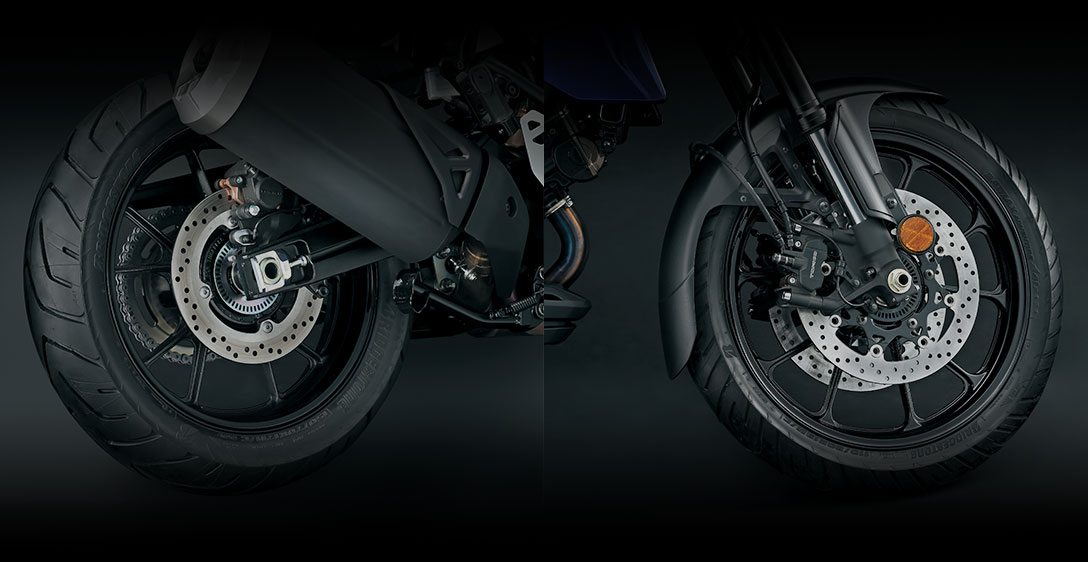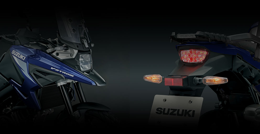 O visual moderno da V-Strom com faróis empilhados verticalmente proporciona beleza em equilíbrio com o visual da moto, aliado a uma performance excelente. Ilumina claramente as superfícies da estrada, à frente e as laterais, resultando em uma grande visibilidade. O novo modelo está equipado com guidão cônico de alumínio. A cabeça do cilindro, a tampa do magneto, a caixa da bomba de água e as tampas da embreagem têm acabamento em bronze, para um belo contraste com o corpo do motor em preto. A forma realça a sensação de estilo off-road. Além disso, é leve, mantendo alta rigidez torcional e resistência a pisos irregulares.