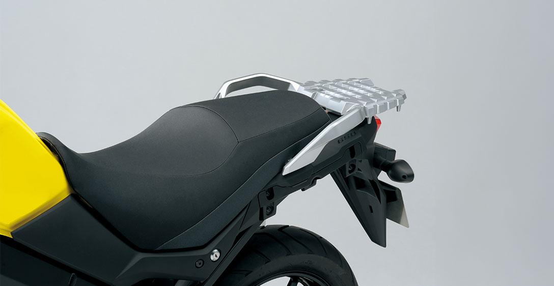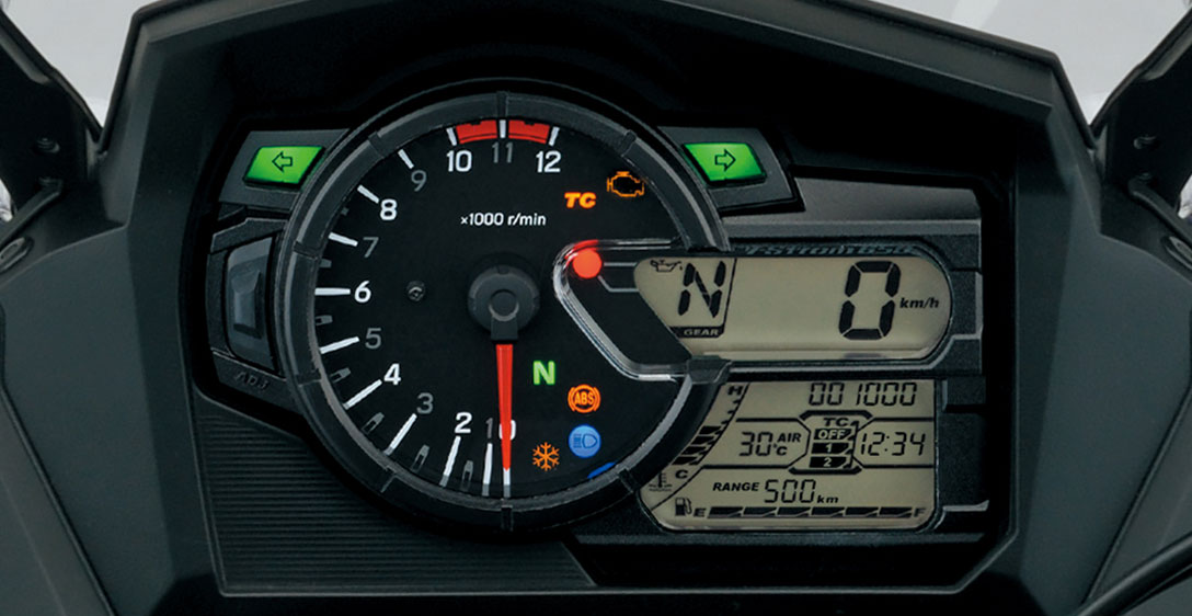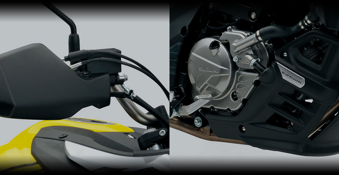 O painel de instrumento é fácil de enxergar e de operar e, compartilhando da mesma imagem de sua irmã maior. A nova V-Strom 650XT agora possui um painel rico em informações com um design moderno, que incorpora um grande tacômetro com leituras analógicas e digitais para leituras sobre a posição da marcha e velocímetro. A seção da parte digital abaixo mostra o odômetro, medidor para duas viagens, relógio, nível do combustível, temperatura da água, temperatura ambiente, voltagem da bateria, autonomia do combustível restante, consumo de combustível médio e instantâneo e modos do controle de tração. A autonomia restante continua a ser mostrada mesmo depois que o marcador de combustível apontar como vazio, oferecendo ao condutor informação precisa e confiável. Além disso, LEDs reconhecíveis providenciam indicadores para congelamento*, farol alto, farol neutro, lâmpada do indicador de defeito (MIL), ABS, modo do controle de tração, e temperatura da água. Toda essa informação é acessível através do botão do punho esquerdo, onde agora também é possível resetar o medidor de viagem. O indicador de congelamento começa a piscar quando a temperatura ambiente cai abaixo dos 3ºC. Ela continua a piscar por 30 segundos e então permanece acesa até que a temperatura ambiente suba além dos 5ºC.