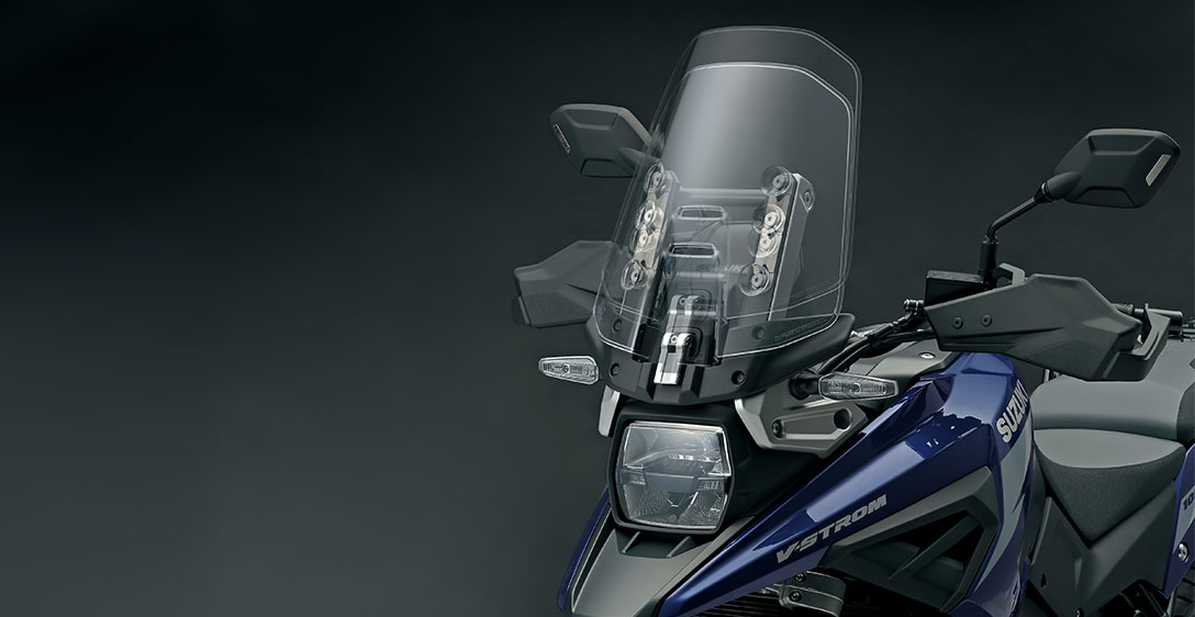 O visual moderno da V-Strom com faróis empilhados verticalmente proporciona beleza em equilíbrio com o visual da moto, aliado a uma performance excelente. Ilumina claramente as superfícies da estrada, à frente e as laterais, resultando em uma grande visibilidade. O novo modelo está equipado com guidão cônico de alumínio. A cabeça do cilindro, a tampa do magneto, a caixa da bomba de água e as tampas da embreagem têm acabamento em bronze, para um belo contraste com o corpo do motor em preto. A forma realça a sensação de estilo off-road. Além disso, é leve, mantendo alta rigidez torcional e resistência a pisos irregulares.